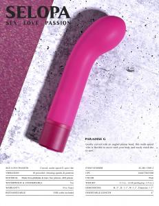 Selopa Paradise G Pink Silicone G-Spot Vibrator from Evolved Novelties. Sex, love and passion. Paradise G Vibrator is gently curved with an angled plump head, this multi-speed vibe is flexible to move with your body and easily reach the G-Spot. Sex, Love, Passion key features: curved, multi-speed G-Spot Vibrator. Vibration: 10 powerful vibrating speeds and patterns. Materials: made from body safe phthalate free and latex free Silicone shaft, ABS Plastic Base. Waterproof vibrations.